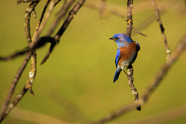 I captured this image on a beautiful spring-like January day on a ranch in Redding, California, USA. This male western bluebird was hanging on a branch of a bare oak tree, surveying the grassy area below for a snack.